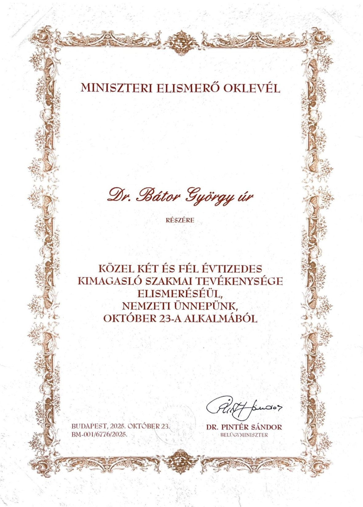 MINISZTERI ELISMERŐ OKLEVÉLBEN RÉSZESÜLT DR. BÁTOR GYÖRGY OSZTÁLYVEZETŐ FŐORVOS